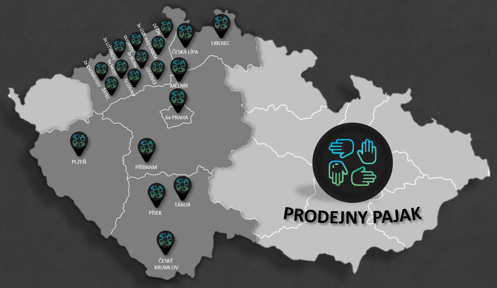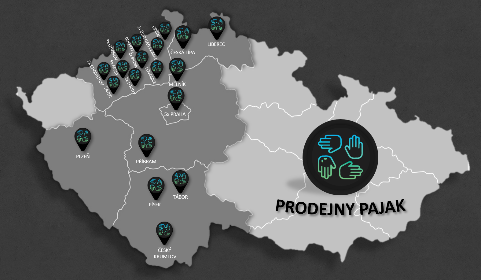 3x Most / 3x Litvínov / 2x Bílina / 2x Louny / 2x Chomutov / Písek / Příbram / Žatec / Český Krumlov / 3x Ústí nad Labem / Lovosice / 5x Praha / České Budějovice / Duchcov / Mělník / Tábor / Plzeň / Česká Lípa / Děčín / Liberec